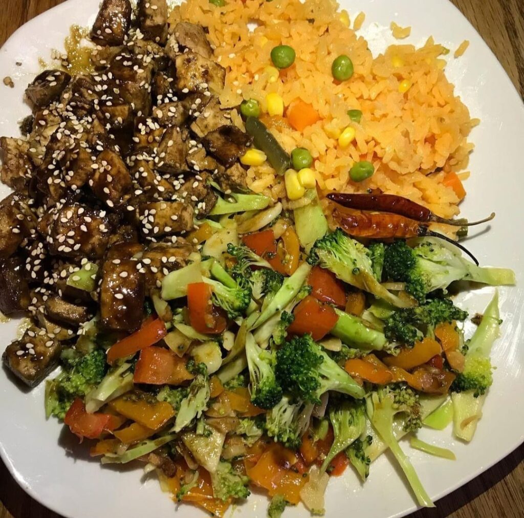 Una vez que tienes todo preparado, en un plato, sirves una porción de tofu y le pones ajonjolí encima, por un lado, el arroz y luego las verduras. Lo puedes acompañar con un chile si te gusta el picante.